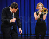 Scarlett Johansson swung by Late Night With Jimmy Fallon yesterday to chat about her upcoming appearance on Saturday Night Live. The duo chatted about her third turn hosting the show, and they also reminisced about a night they shared long ago playing quarters in Baltimore while she shot He's Just Not That Into You, which was produced by Jimmy's wife Nancy. They also joked about how Iron Man 2 star Scarlett has a special superhero room in her house that she shares with her Green Lantern actor husband Ryan Reynolds -�Scarlett is adding even more to her resume with a sci-fi project and a rumored role opposite Matt Damon in We Bought a Zoo. Jimmy then presented his latest musical challenge to a celeb by introducing a game of "Name That Tune" -�check out the video below.